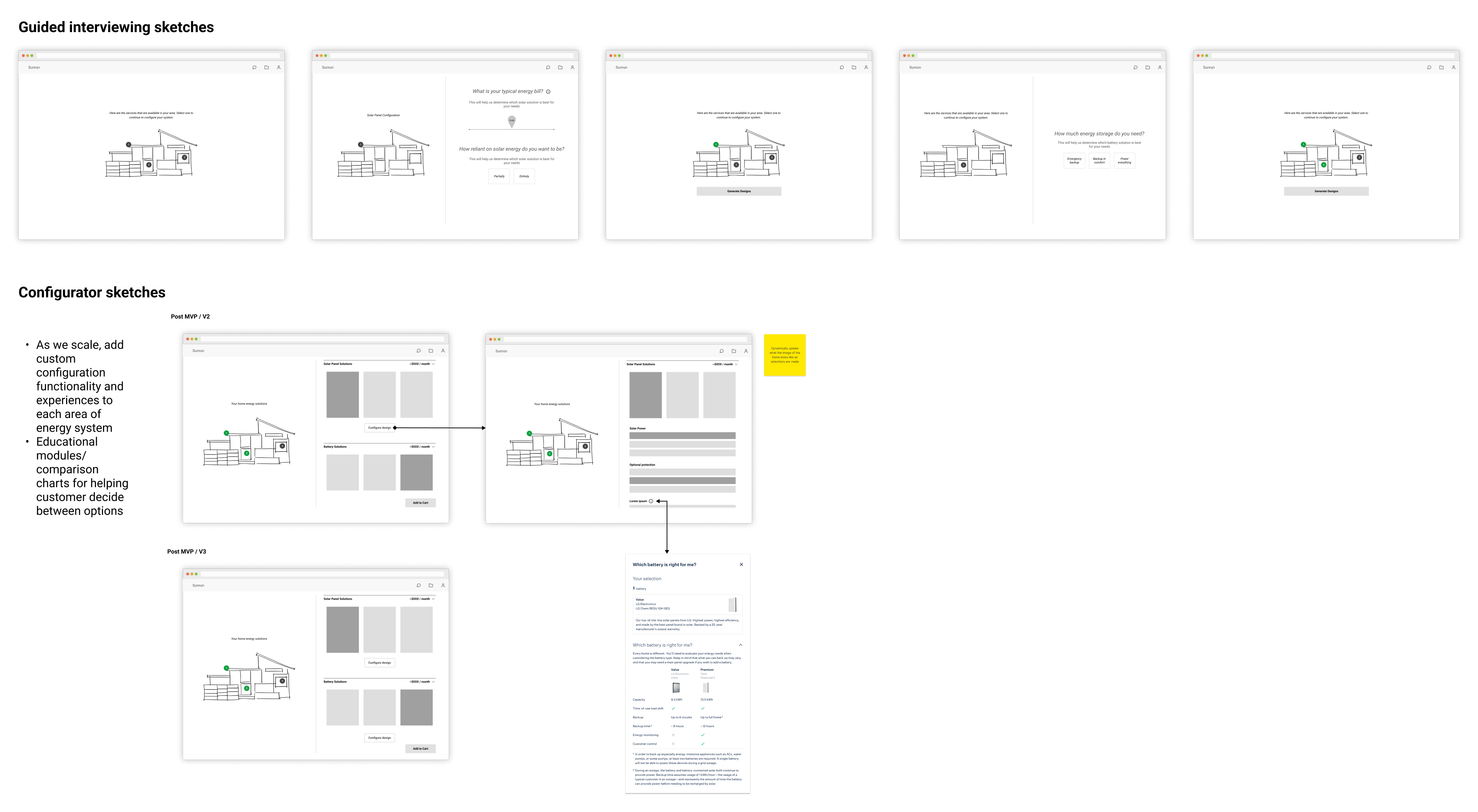 We sketched various ideas and concepts for what our solar eCommerce experience could look like. After multiple rounds of feedback from our stakeholders, we settled on a journey to follow. From there, we were ready to begin putting together wireframes for development.