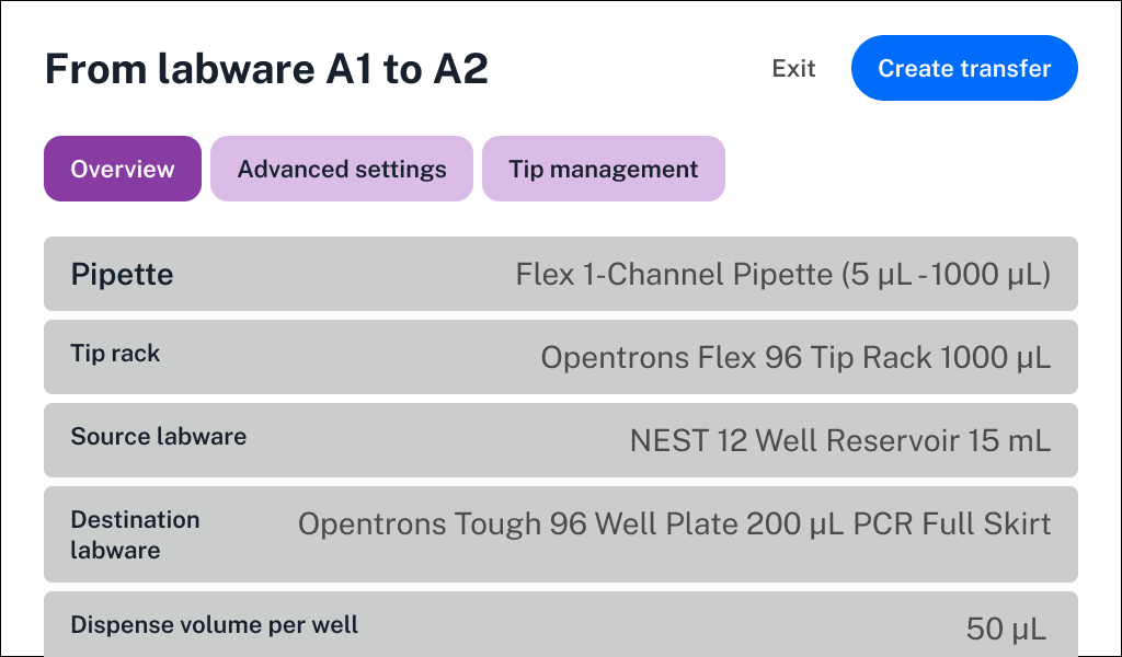 The quick transfer experience offers quick and easy workflow automation using the Flex robot touchscreen. Primarily geared towards basic lab automation tasks like plate filling and prep protocols, quick transfers are an entry point into beginning to automate in your lab.